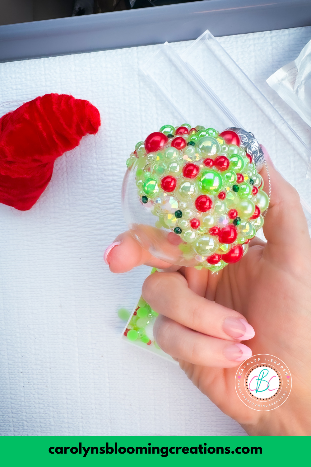 Rhinestones and pearl sets in red and green colors (I order bulk packs from Amazon…the link is to Amazon. I also order from Temu and if ordering from Temu, use my code afe55197 or use this link to get 30% off for new users)