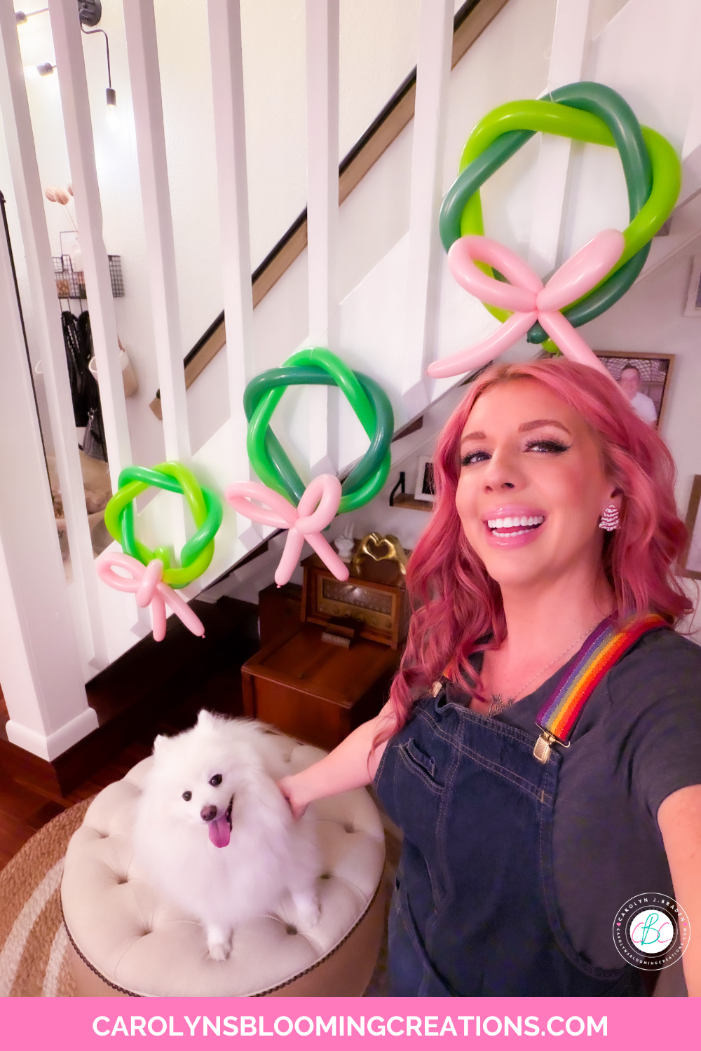 Every holiday and birthday in our family, I try to come up with a new balloon “animal” or balloon sculpture to try. This year, I was feeling wreaths, bows and holly bush colors, so I decided to come up with an easy green and pink balloon wreath.