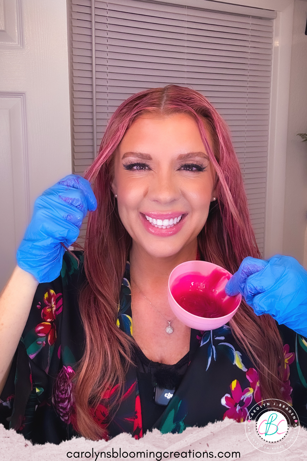 With the Kiss branded tints, I mix a little of the rose gold, a tiny bit of the atomic pink (use gloves!) and a bit of Olaplex. I smooth it into my dry hair, leave it on for 30 minutes or so, then shampoo it out. It brightens my color, hydrates my hair and lasts a week or so.