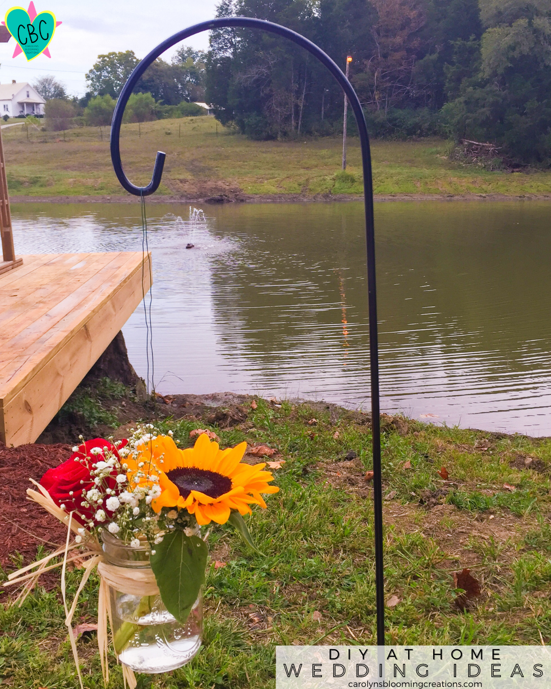 clear glass mason jars and wire (for the table flower decor and to hang on the shepherd’s hooks around the wedding ceremony area)