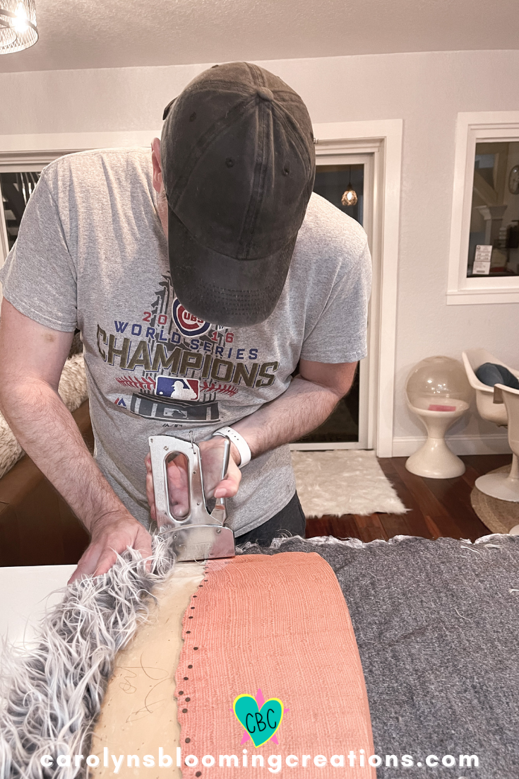 After laying out the fabric, we used a staple gun (with heavy duty staples) and started stapling away. I had my husband do this part of it because he was able to put a little more force behind it. The wood of the chair was really tough!