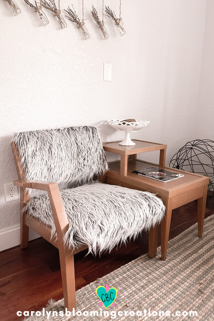 Our phone chair was unique because it was in two parts; one being a table with a shelf and drawer and the other being the chair. Because it was in two parts, it made recovering it super easy!